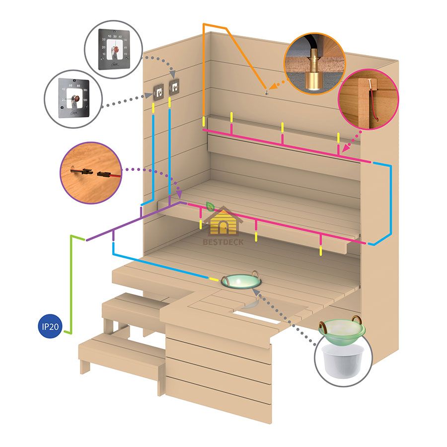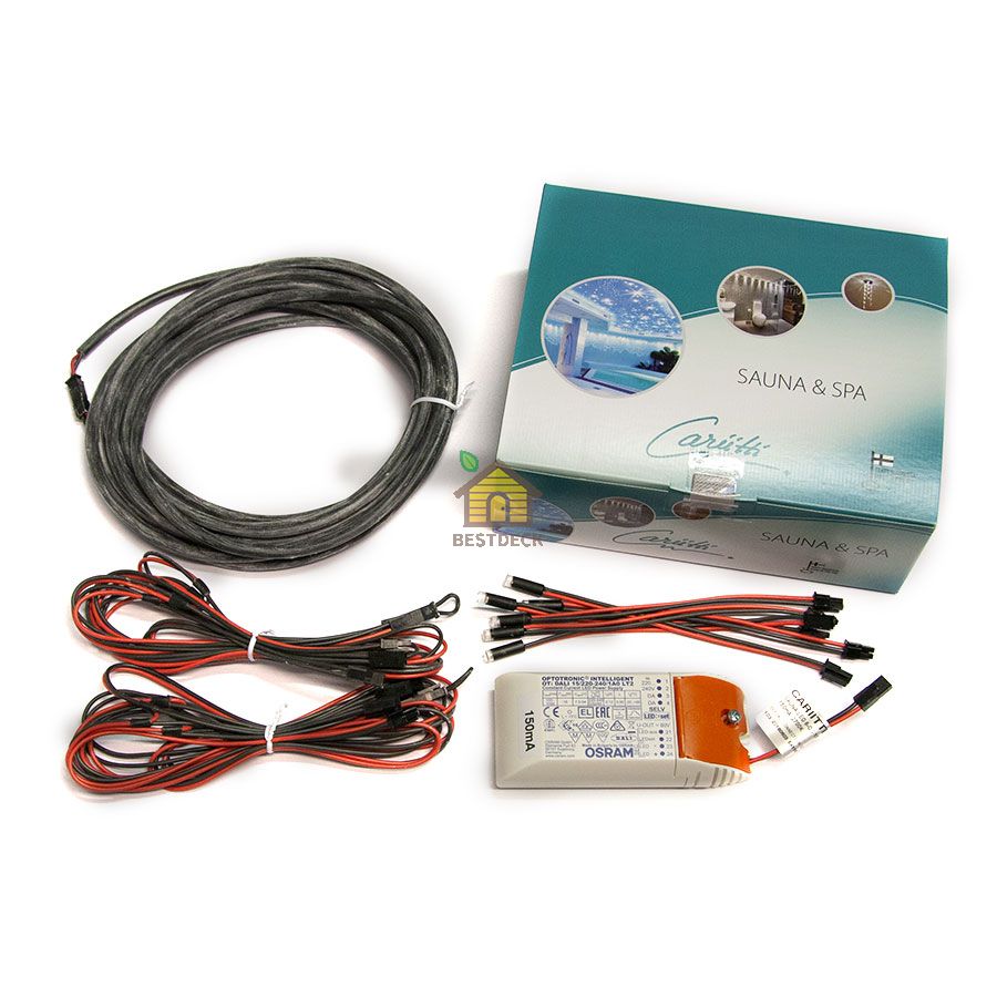 Комплект для светодиодной подсветки сауны. Используется с аксессуарами Cariitti: термометром, гигрометром, шайкой и другими. Возможна установка на полках, для этого потребуются отверстия диаметром 6 мм. В наборе: 6 светодиодов 2700 К c IP 67, провода для последовательного подключения, 2 перемычки, удлинитель на 5 м, блок питания Osram OTi 15 DALI (IP 20, 150 мА, 3–15 Вт).