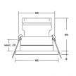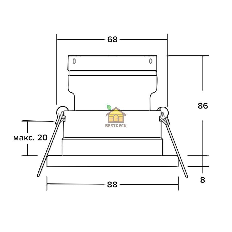 Для установки потребуется вырез в потолке диаметром 68 мм. Глубина установки 86 мм + длина лампы. Для установки со стопорными пружинами максимальная высота потолка должна быть не более 20 мм. Для потолка большей толщины возможна установка на невидимые саморезы.