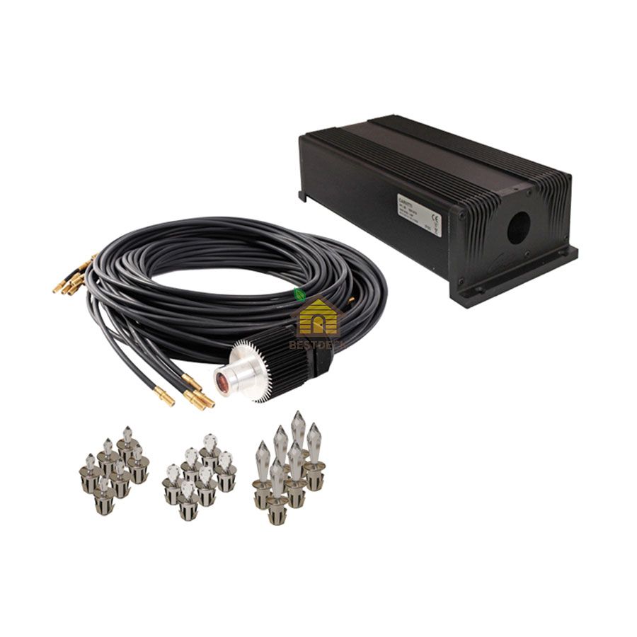 В комплекте: проектор, 100 стандартных волокон, 18 волокон с хрустальными насадками Swarovski. Корпус насадок доступен в цветах: хром и золото. Диаметр волокон: 0,75 мм и 3 мм для кристаллов. Волокна из акрила подходят для паровых кабин и инфракрасных саун с температурой ниже 80 °C.